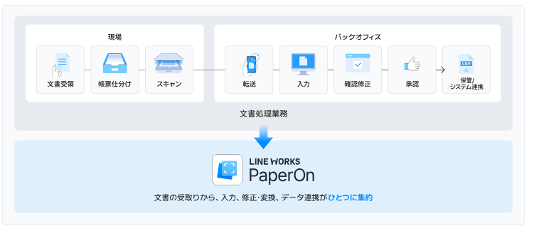 ただし、LINE WORKSと併用いただくことでモバイルからの帳票アップロード機能やDriveとの連携機能等がご利用可能になり、LINE WORKS PaperOn単体でご利用いただく場合より、一層業務を効率化することができます。