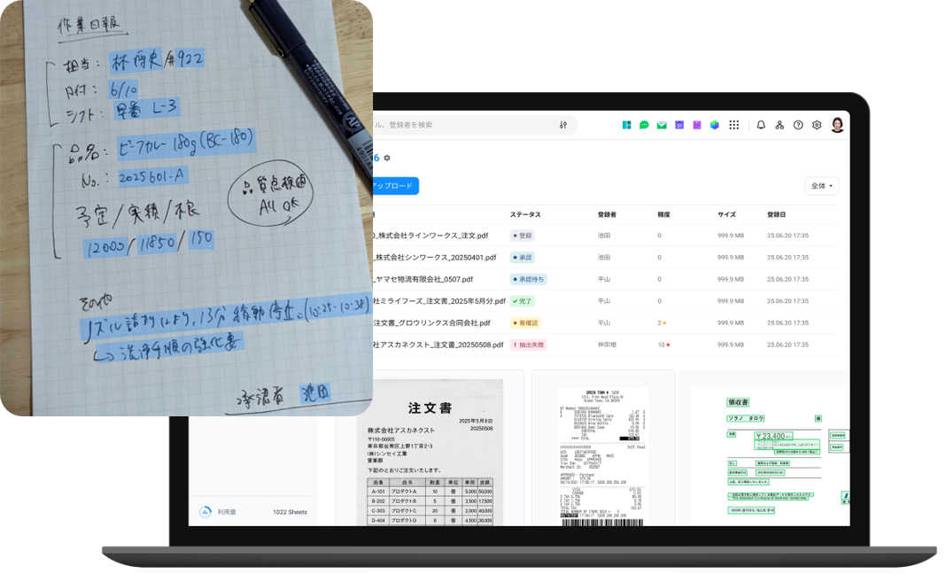 PaperOnで製造現場で書かれた日報を、撮って送るだけで即データ化。集計・突き合わせ・共有までが一気に進みます。