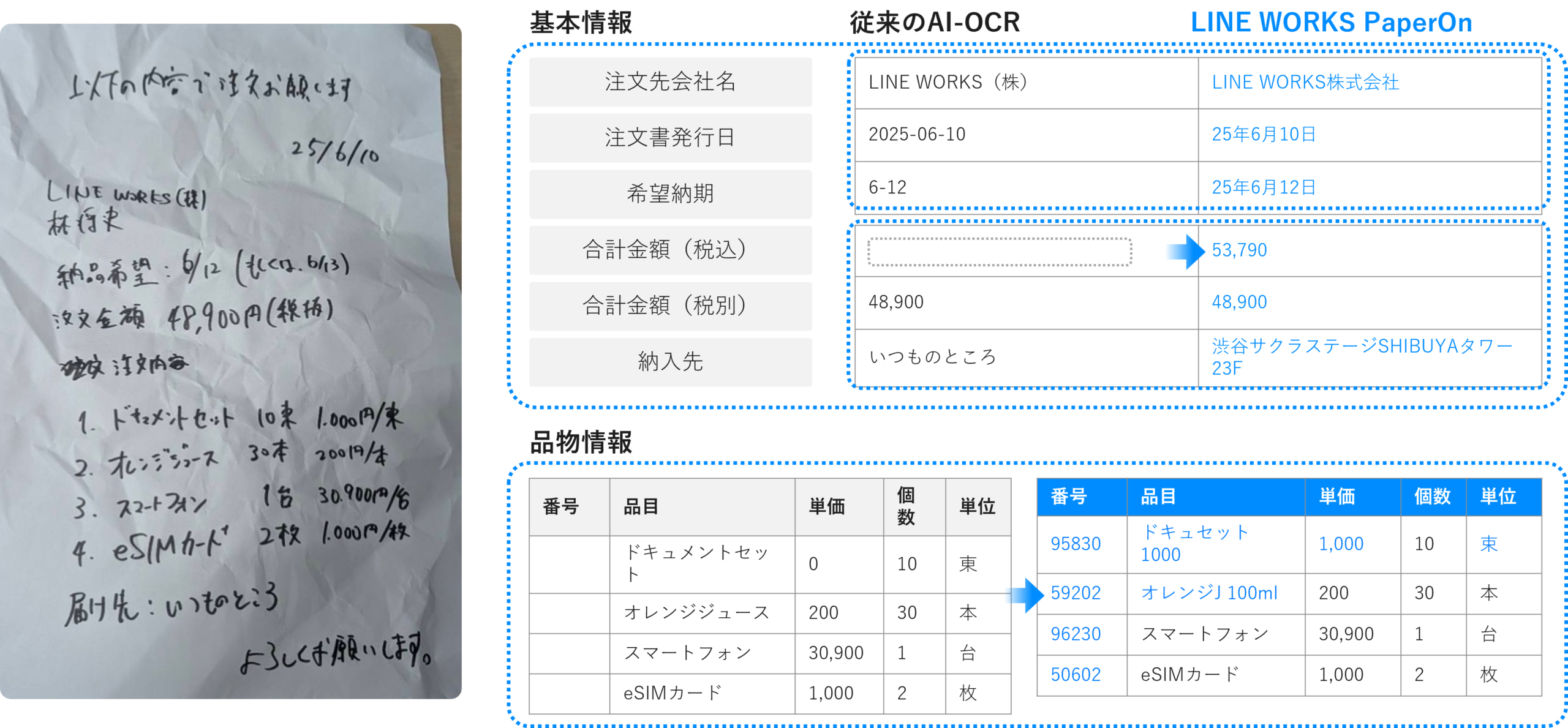 紙の注文書や日報から、商品名や数量など必要な情報を自動で読み取る機能。